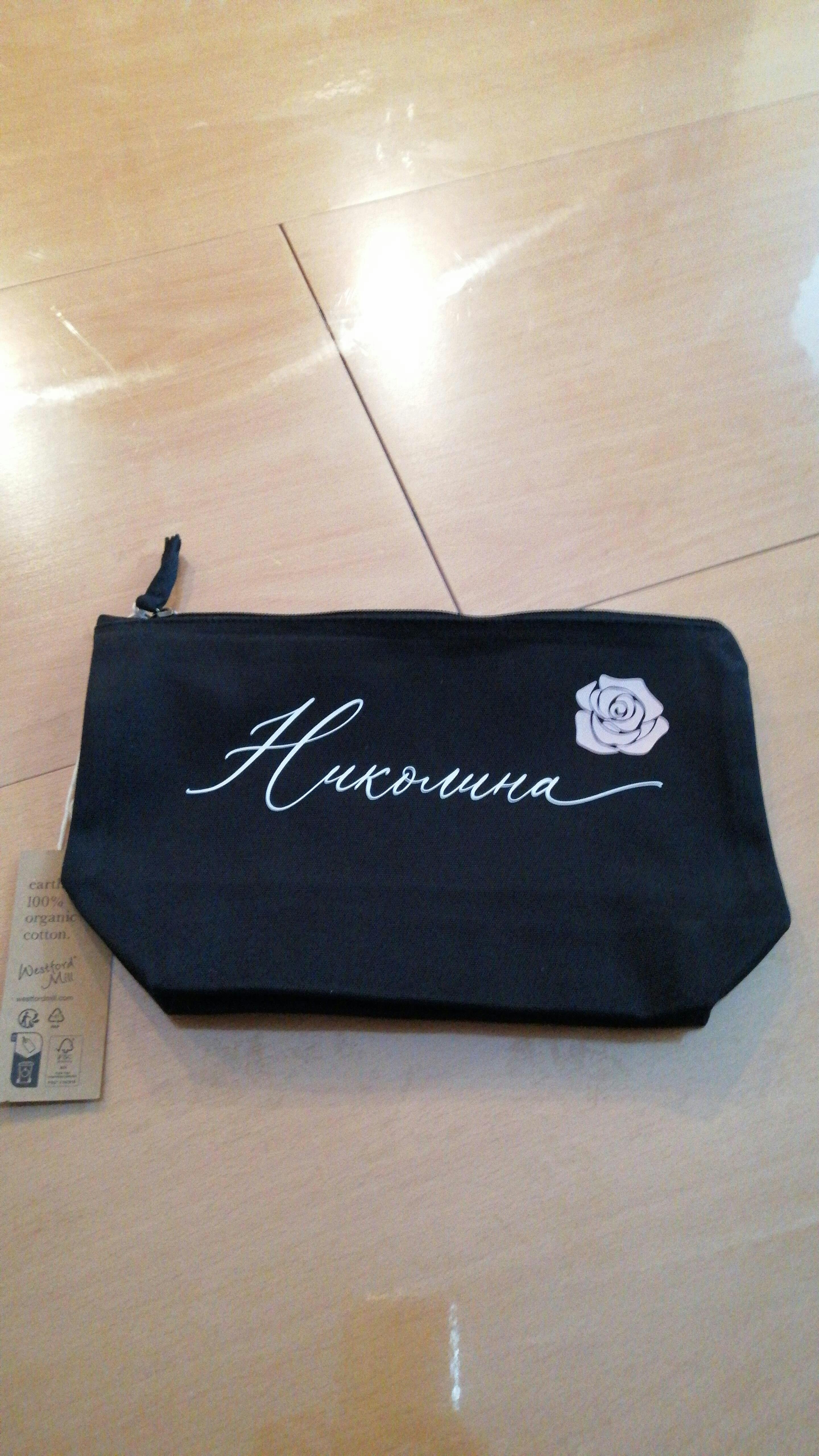 Оригинален подарък за рожден ден на жена – чантичка за гримове с име и роза